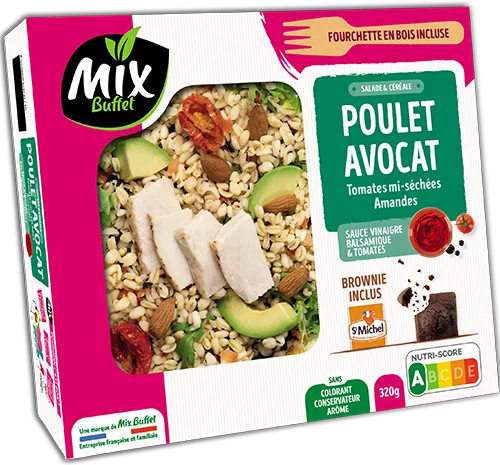 Tomates 17,1%, blé dur cuit 13,4% (eau, blé dur), petit épeautre cuit 13,4% (blé de petit épeautre, eau), petits pois doux, fromage de chèvre 8,4%, quinoa rouge cuit (eau, quinoa rouge), haricots azuki, huile de colza, eau, amandes 2,8%, tomates mi-séchées marinées 2,4% (tomates mi-séchées, huile de tournesol, sel), échalotes, vinaigre d’alcool, sel, jus de citron concentré, basilic, huile de noisette (huile vierge de noisette, huile de noisette raffinée), huile d’olive vierge extra, huile de tournesol, moutarde de Dijon (eau, graines de moutarde, vinaigre d’alcool, sel), persil, sucre, amidon modifié de pomme de terre, poivre, ail, épaississant : gomme xanthane.