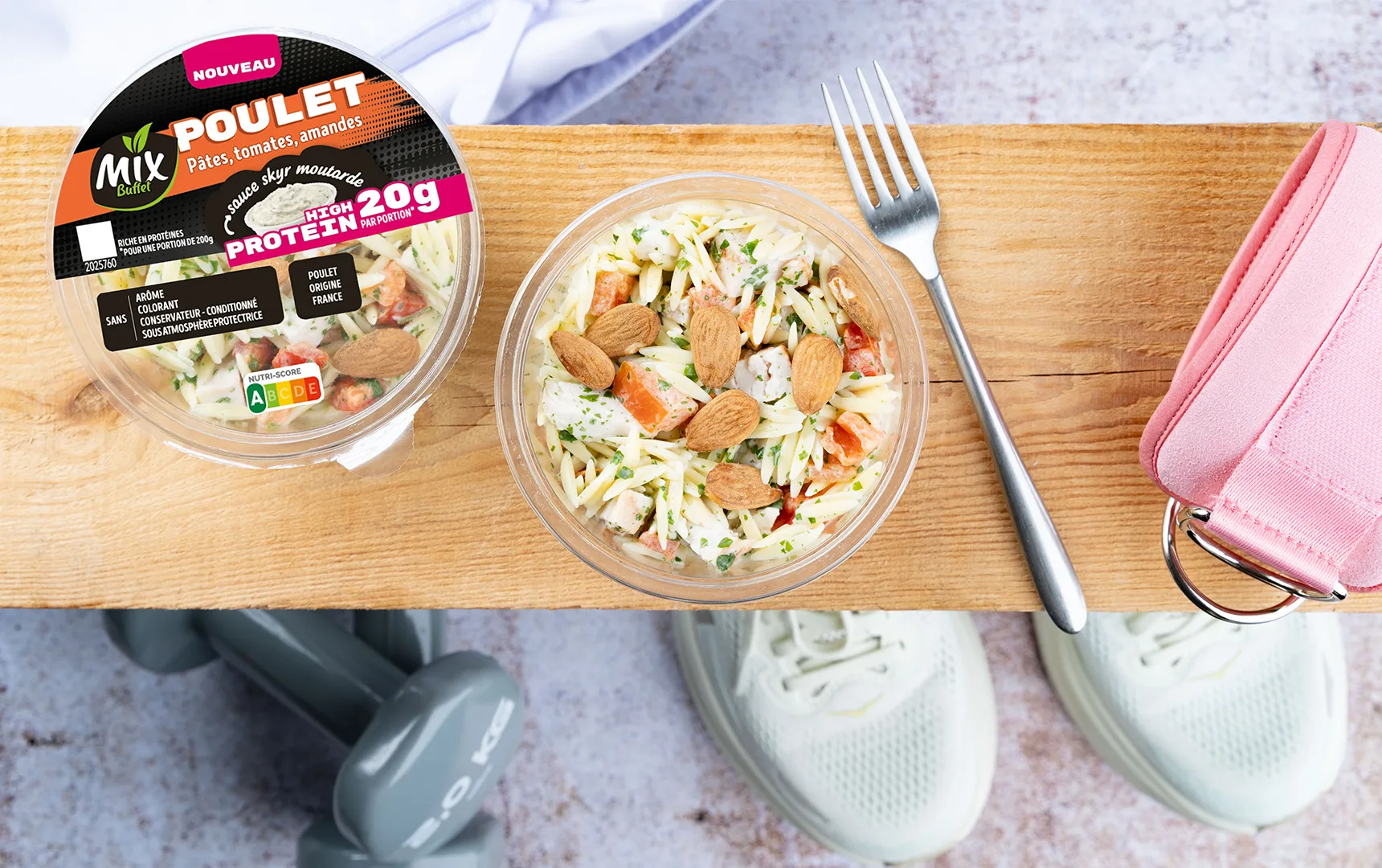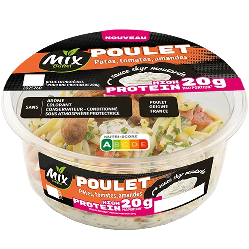Pâtes alimentaires pépinettes aux œufs cuites 38,3% (eau, semoule de blé dur de qualité supérieure, œufs), cubes de filet de poulet traité en salaison rôti 20,5% (filet de poulet 16,8%, eau, dextrose, fécule de manioc, sel), fromage frais à 0% de matières grasses 17,7%, tomates 7,3%, amandes 4%, vinaigre d’alcool, huile de colza, persil, eau, moutarde de Dijon 0,7% (eau, graines de moutarde, vinaigre d’alcool, sel), ail, échalote, sel, jus de citron concentré, épaississant : gomme xanthane.