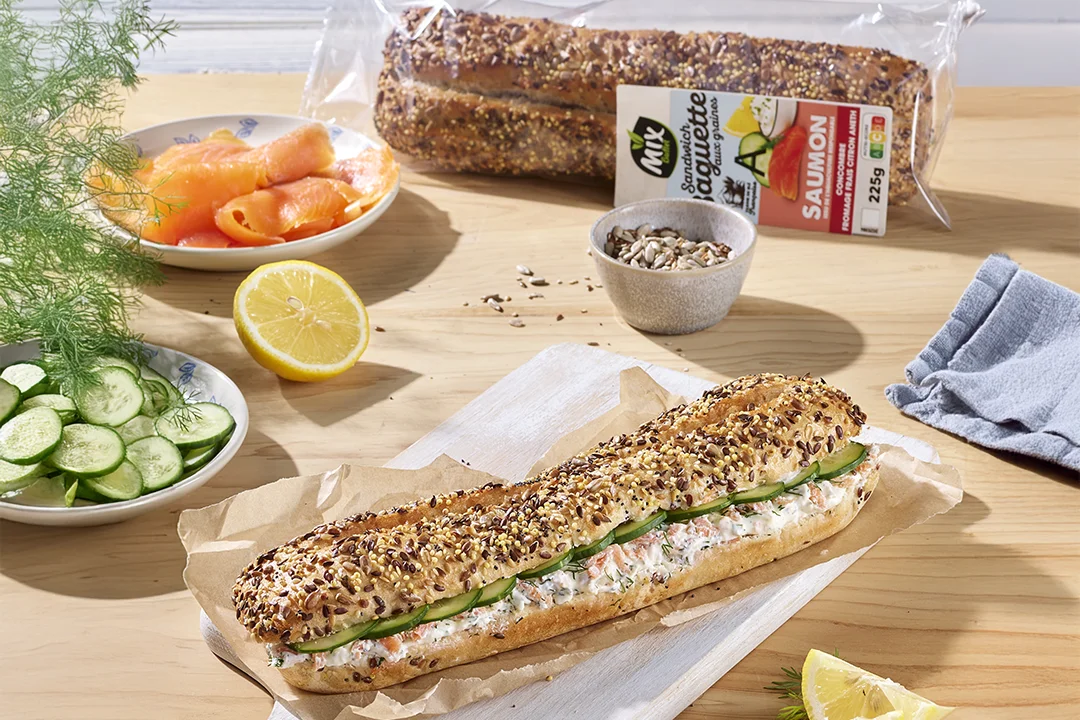 Pain spécial aux graines cuit 60% [farine de blé 32,3% (farine de blé, farine de blé malté), eau, farine de seigle, mélange de graines 1,7% (graines de lin brun, graines de millet, graines de tournesol, graines de pavot, graines de sésame, graines de lin jaune), levure de panification, sel, farine de soja, jus concentré d’acérola], concombres 13,3%, SAUMON fumé 9,7% (saumon Atlantique Salmo salar, sel), fromage frais 9,2% (fromage frais, sel), fromage blanc, ciboulette 0,7%, jus de citron concentré 0,7%, aneth 0,5%, épaississant : gomme xanthane, poivre.