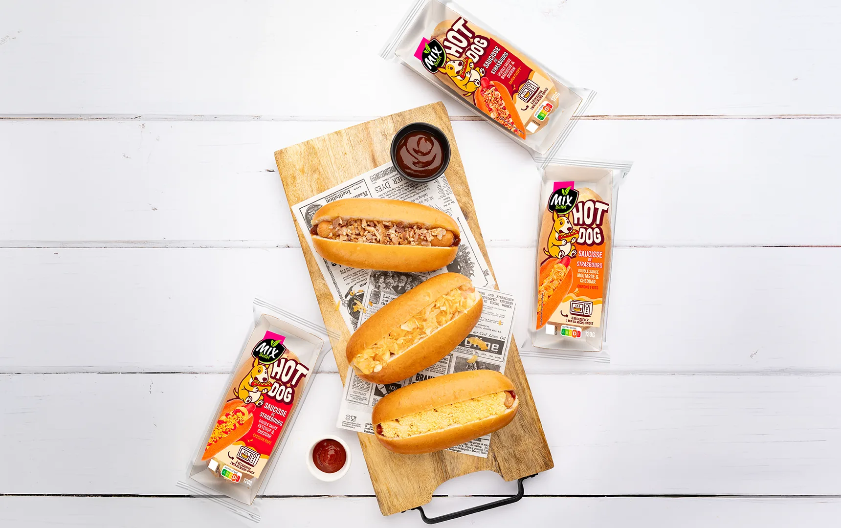 Pain spécial cuit 41,7% [farine de blé (farine de blé, gluten de blé, farine de blé malté, agent de traitement de la farine : acide ascorbique), lait demi-écrémé, eau, œuf, sucre roux, huile de colza, levure de panification, jaune d’œuf, sel, farine de soja, jus concentré d’acérola], saucisse de Strasbourg 44,2% (viande de porc 33,5%, eau, sel, protéines de lait, lactose, dextrose, gras de porc, épices et extraits d’épices, arômes naturels), sauce à la moutarde 7,5% [moutarde 3,7% (eau, vinaigre d’alcool, graines de moutarde, sel, acidifiant : acide citrique, sucre, curcuma, antioxydant : disulfite de potassium, arômes), eau, miel, amidon modifié, vinaigre d’alcool, sucre, épices et extraits d’épices], sauce au cheddar 4,1% (eau, cheddar 1,2%, fromage, lait écrémé en poudre, beurre, amidon, sel, colorant : extrait de paprika), oignons frits 2,5% (oignons, huile de tournesol).